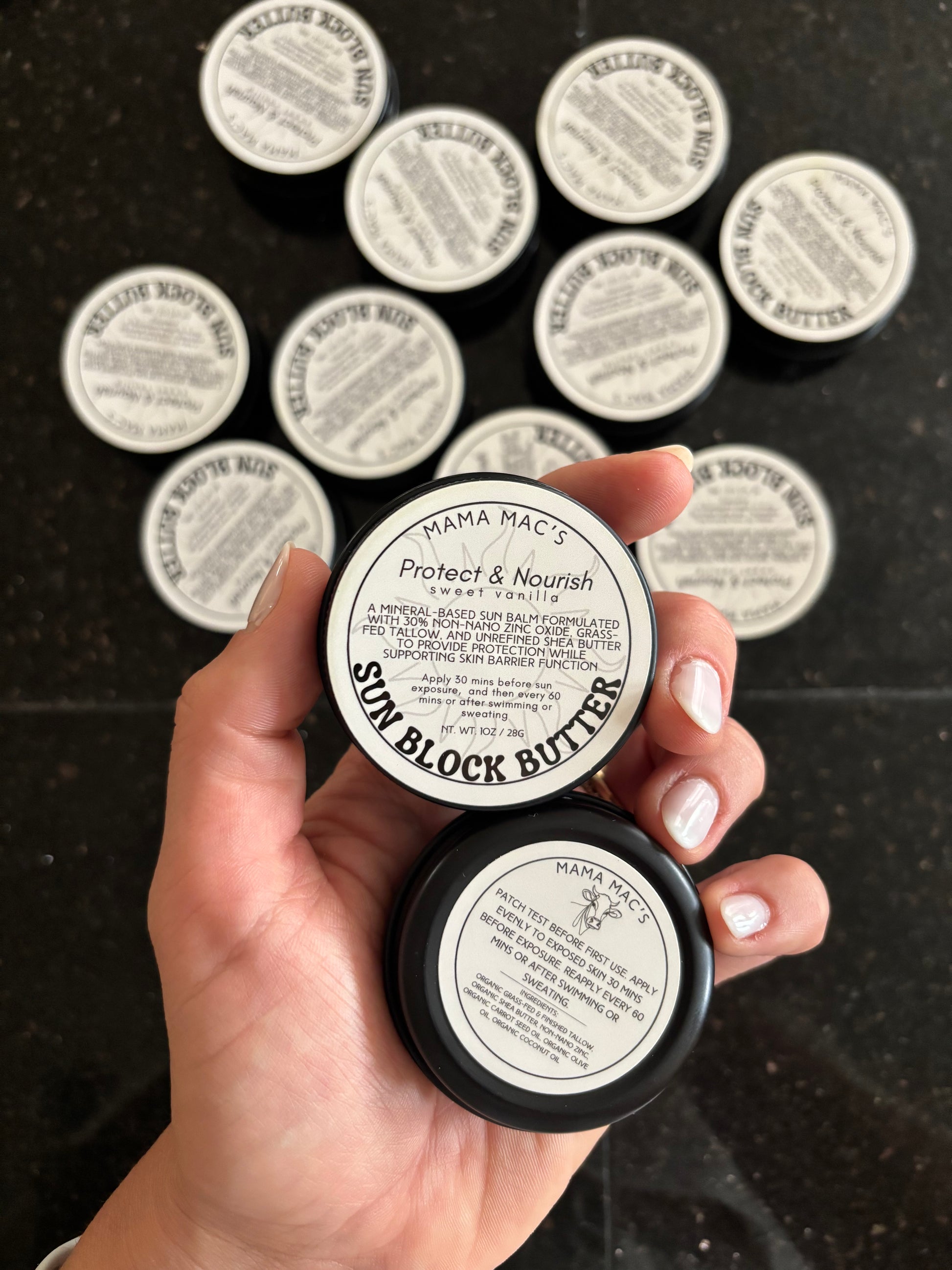 Our handcrafted Sun Block Butter is a nourishing, mineral-based balm made with whole, skin-loving ingredients designed to support and protect your skin—naturally. Formulated with 30% non-nano zinc oxide, it creates a physical barrier that reflects UVA and UVB rays without absorbing into your skin.